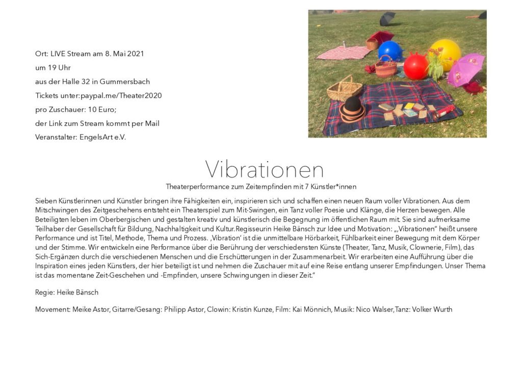 Ort: LIVE Stream am 8. Mai 2021 um 19 Uhr aus der Halle 32 in Gummersbach Tickets unter: paypal.me/Theater2020, pro Zuschauer: 10 Euro; der Link zum Stream kommt per Mail. Veranstalter: EngelsArt e.V