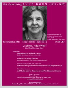 Der 100. Geburtstag der Schriftstellerin Anne Dorn bietet Anlass zu einer Ehrung und einer Werkschau. Neben dem biographischen Werdegang soll vor allem das facettenreiche literarische Werk Anne Dorns gewürdigt werden.
