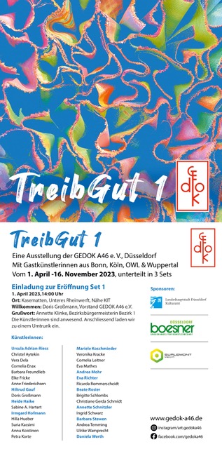“TreibGut 1” ist das Thema einer Ausstellung, die die GEDOK A46 e. V. in drei Folgen vom 1. April bis zum 16. November 2023 in den Kasematten am Rhein in Düsseldorf installieren wird.