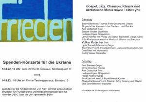 Programm: Gospel, Jazz, Chanson, Klassik und ukrainische Musik sowie Texte/Lyrik